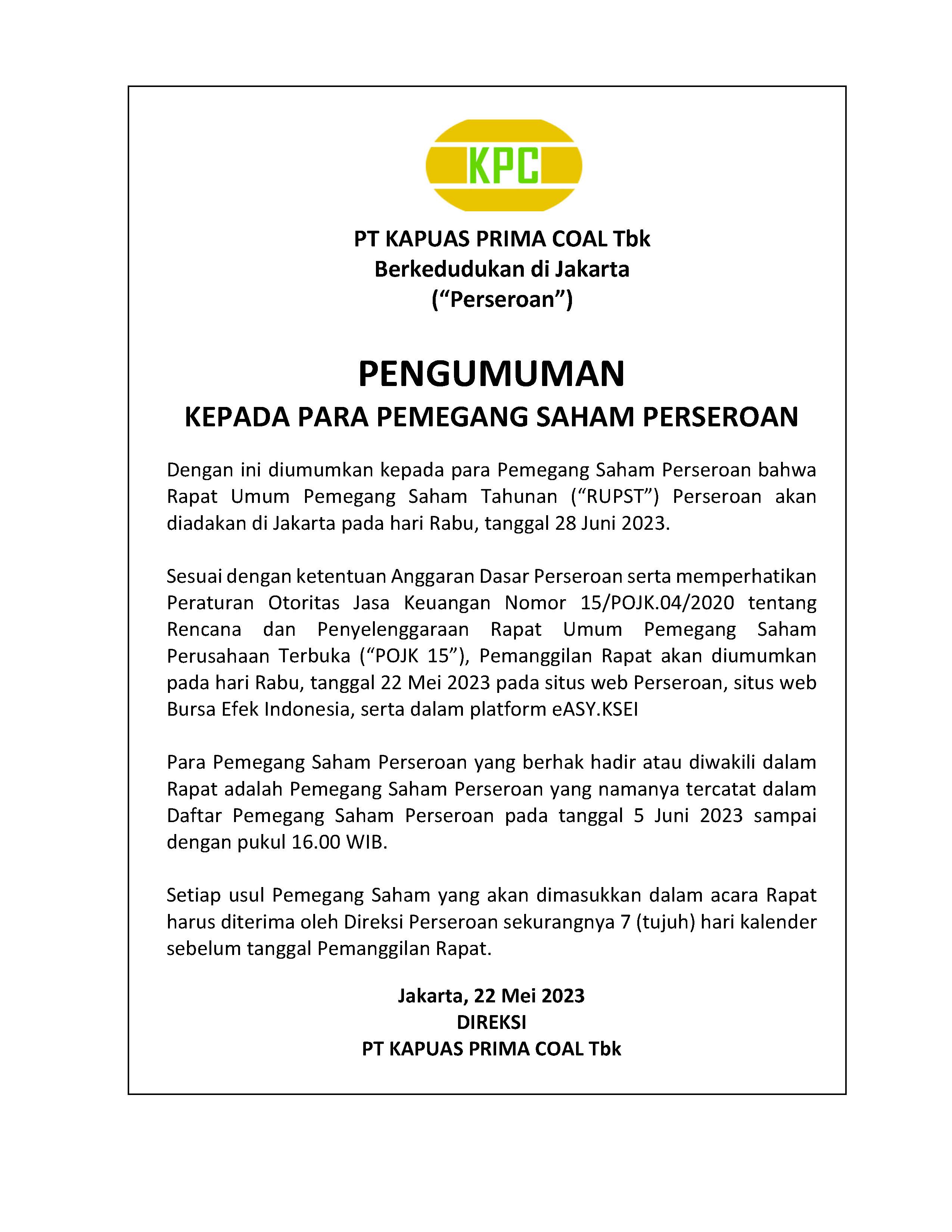 Dengan ini Direksi PT. KAPUAS PRIMA COAL Tbk (“Perseroan”) mengundang para pemegang saham Perseroan untuk menghadiri Rapat Umum Pemegang Saham Tahunan (“RUPST”) selanjutnya disebut “RAPAT”), yang akan diselenggarakan pada Rabu, 28 Juni 2023. Klik link dibawah untuk detail lengkap nya.