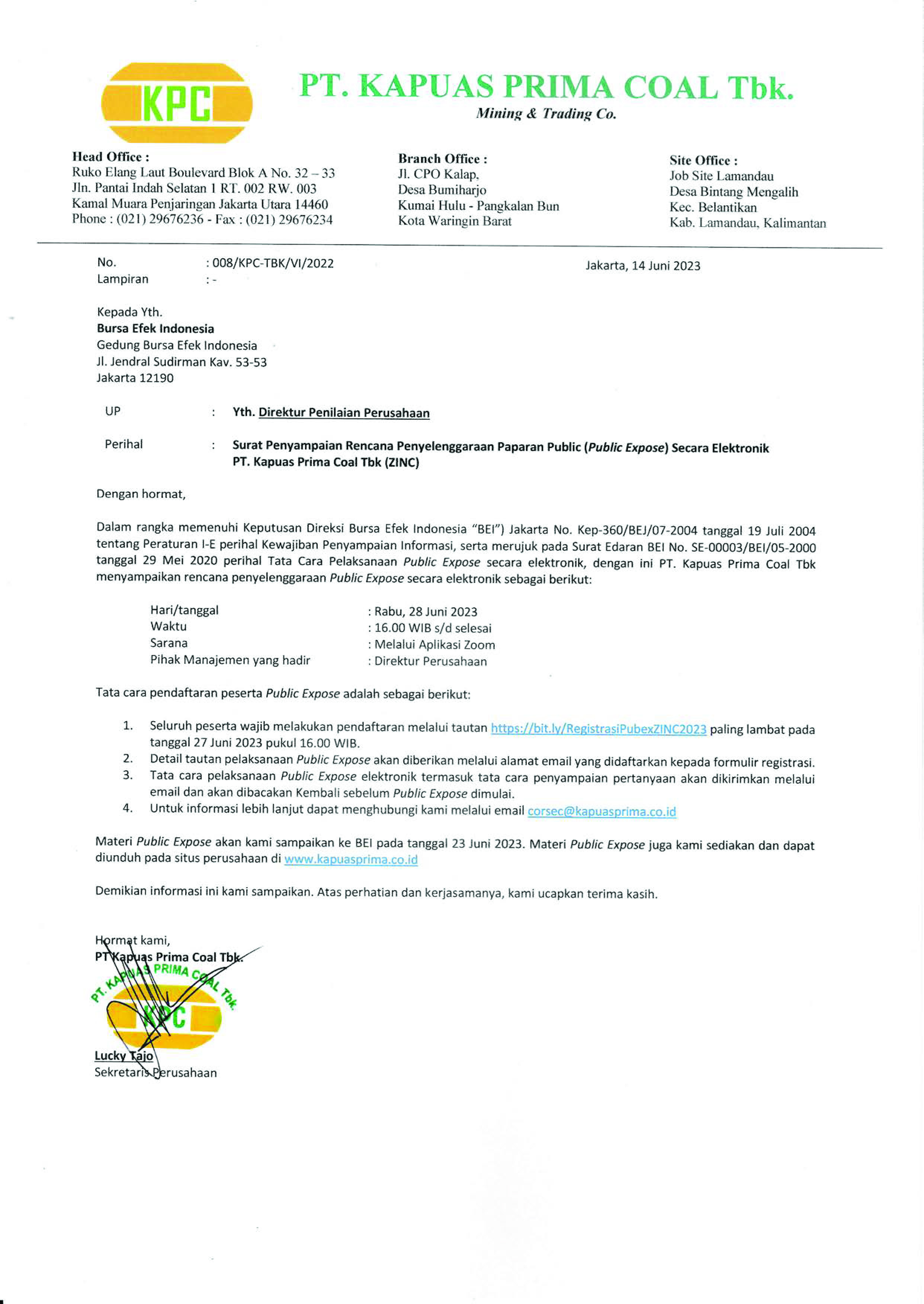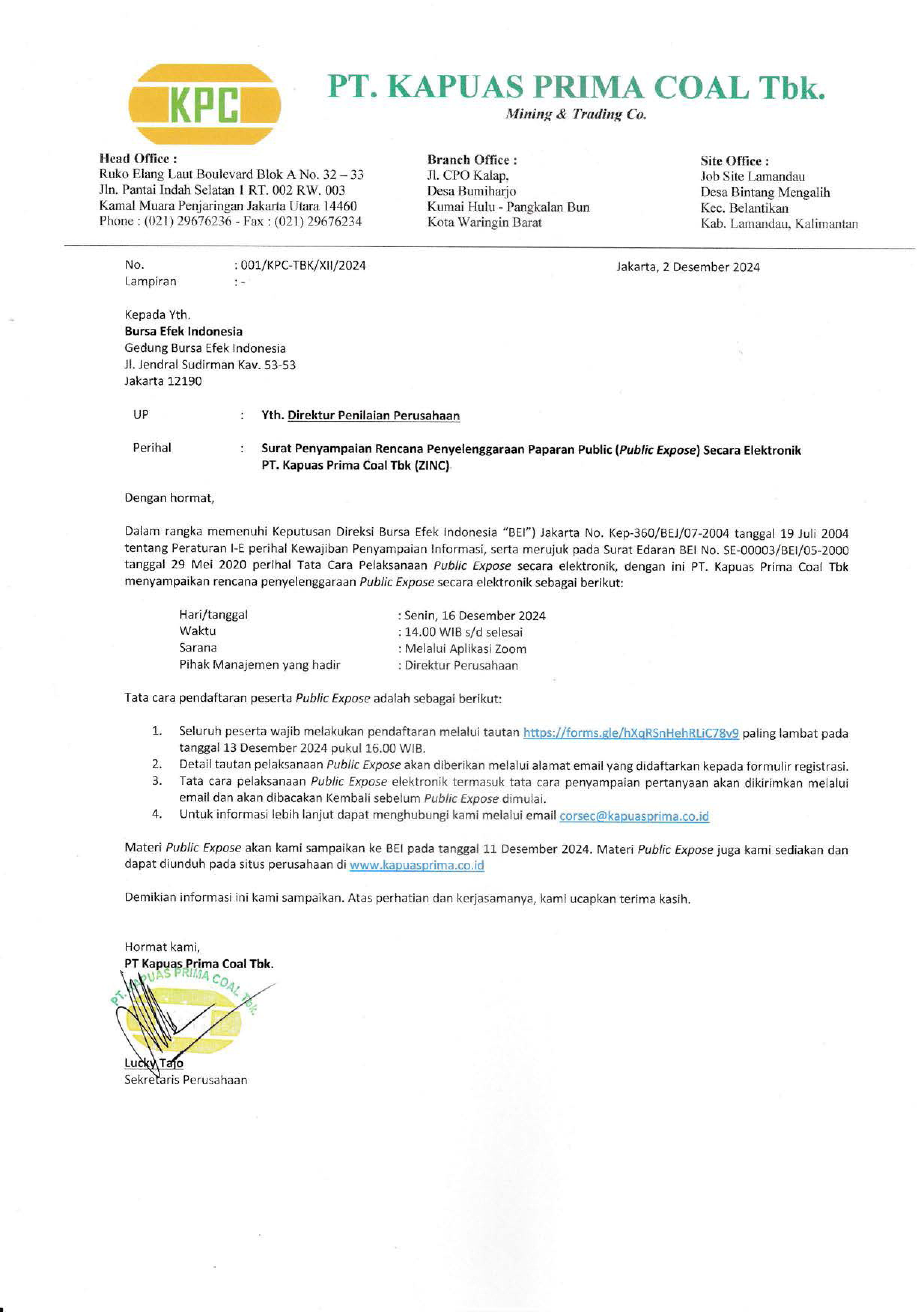 PT. Kapuas Prima Coal Tbk (“Perseroan”) menyampaikan pemberitahuan rencana penyelenggaraan Paparan Publik (Public Expose) Tahunan secara elektronik sebagai berikut: