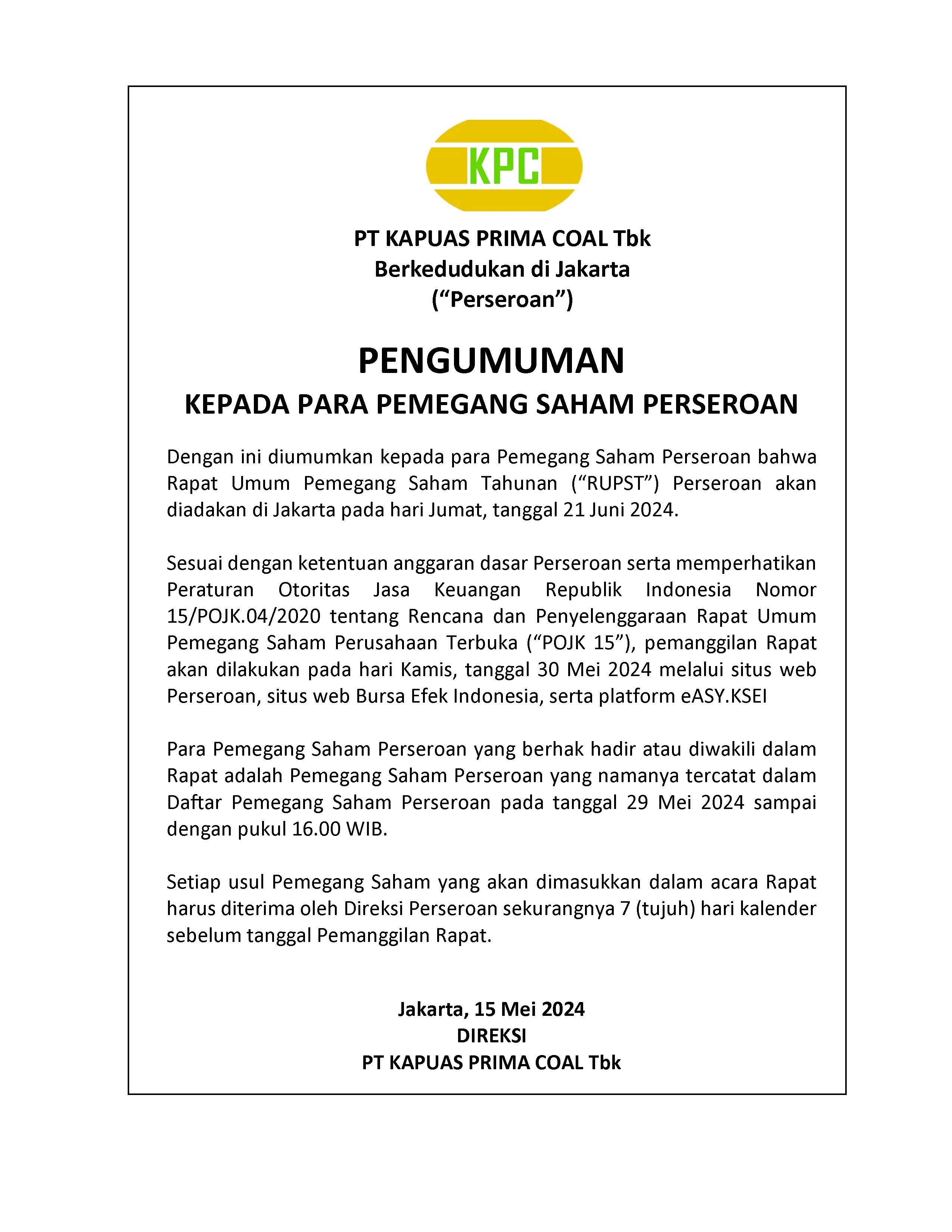 Dengan ini Direksi PT. KAPUAS PRIMA COAL Tbk (“Perseroan”) mengundang para pemegang saham Perseroan untuk menghadiri Rapat Umum Pemegang Saham Tahunan (“RUPST”) selanjutnya disebut “RAPAT”), yang akan diselenggarakan pada Jumat, 28 Juni 2023. Klik link dibawah untuk detail lengkap nya.