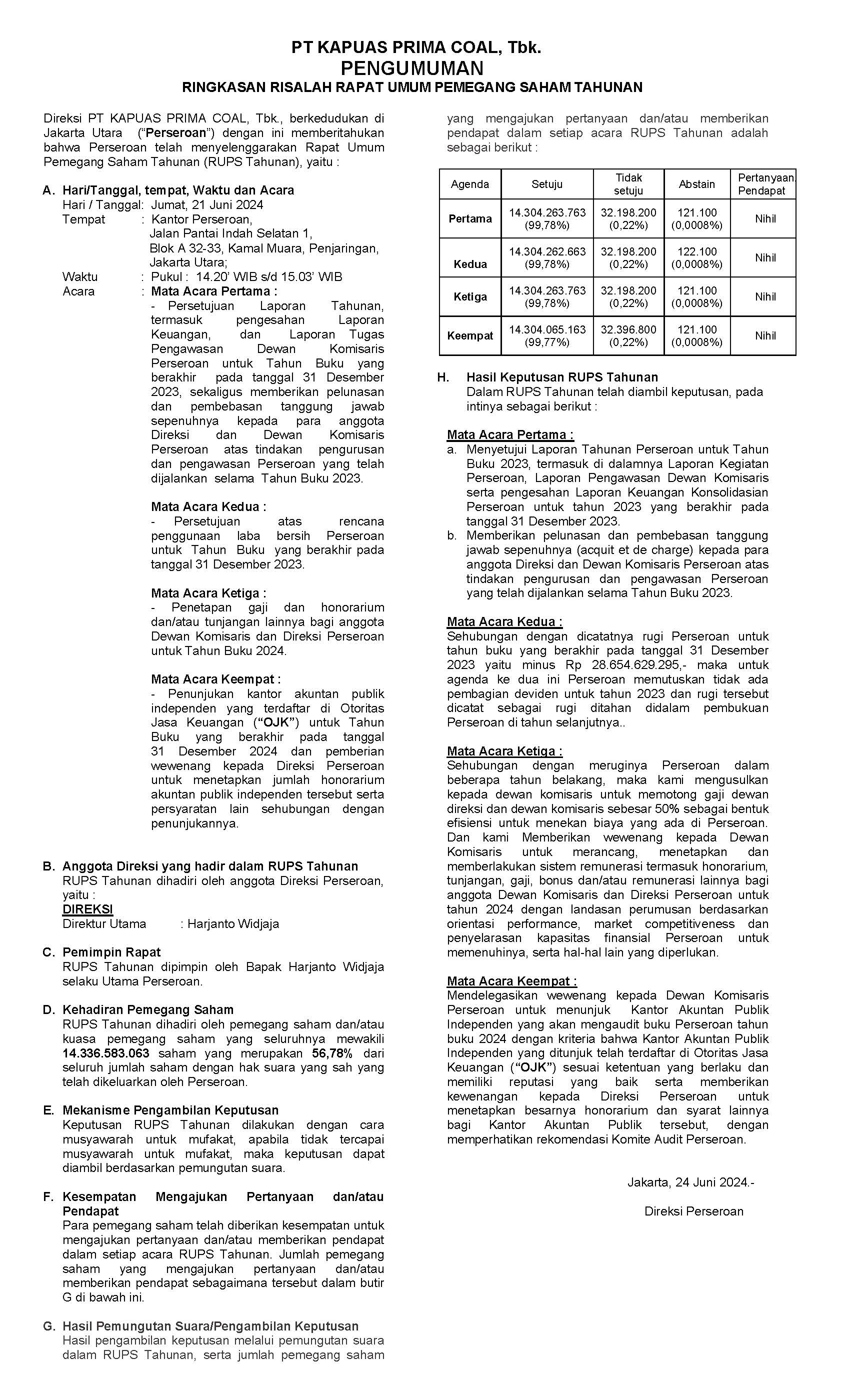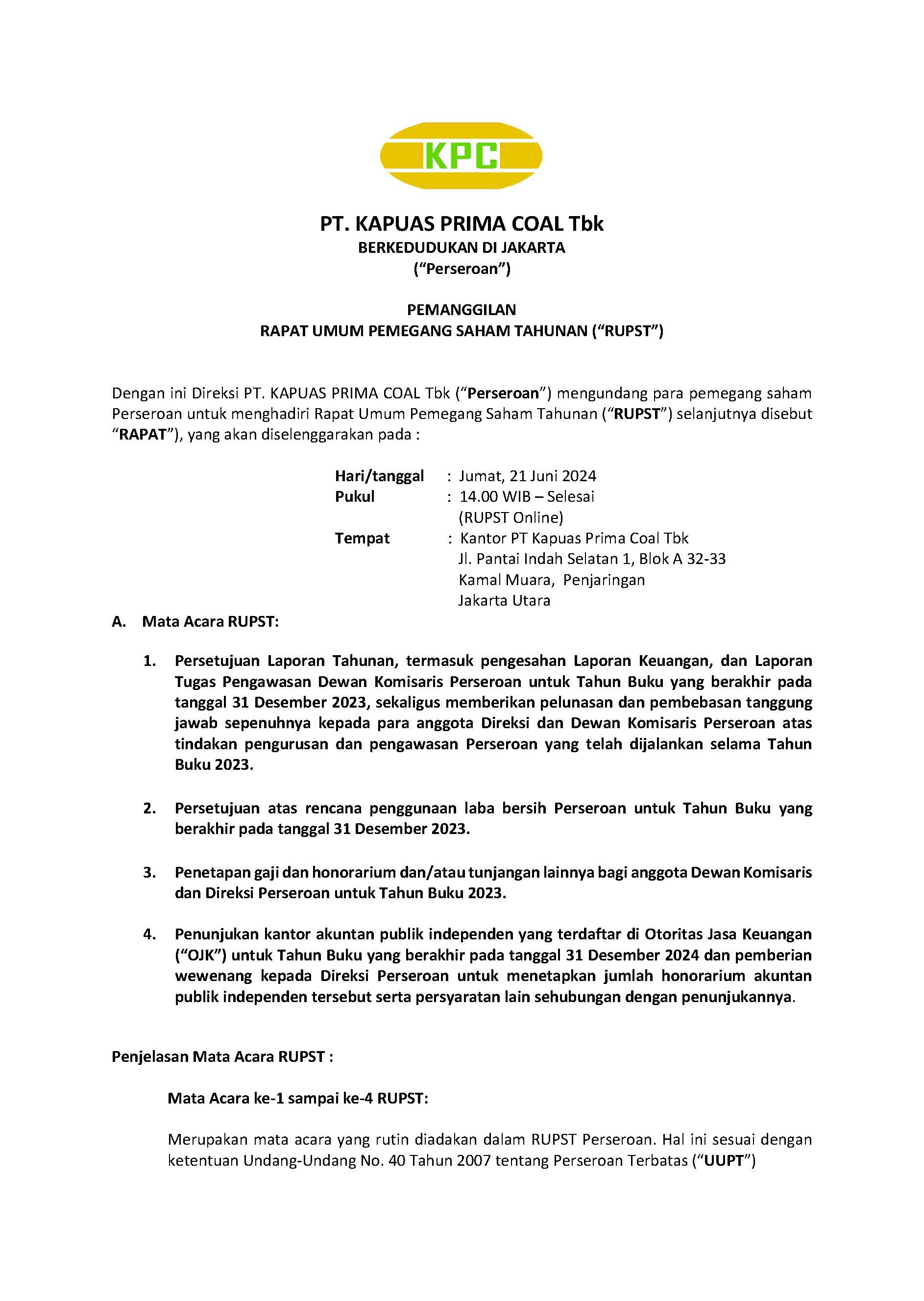 Berikut adalah hasil ringkasan dari Rapat Umum Pemegang Saham Tahunan PT KPC Tbk, yang diadakan pada hari Jumat tanggal 21 Juni 2024.